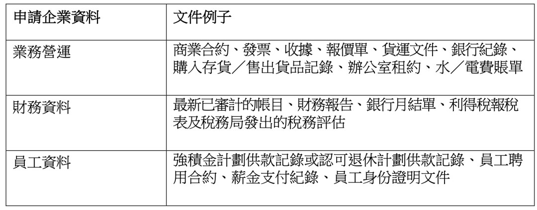 申请企业必须提供相关文件,证明企业在申请资助期间在香港拥有实质业务,有关证明文件包括员工记录、报税表、或商业交易文件如商业合约、发票等。