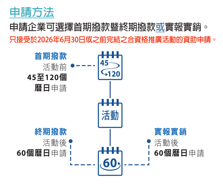 首期拨款+终期拨款:推广活动前就活动开支预算提交首期拨款申请,完成后,就开支余额提交终期拨款申请。同一活动的首期拨款申请及其相应的终期拨款申请共同构成单一申请。每宗申请的资助上限将适用于该宗申请最高可获的核准政府资助总额。