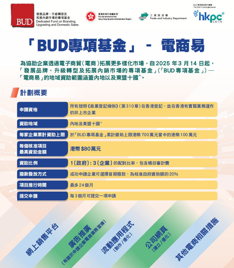 全称为“发展品牌、升级转型及拓展内销市场的专项基金”(BUD Fund),由香港工业贸易署管理,旨在支持企业提升品牌价值、推动业务升级转型,并拓展内地及海外市场。主要针对在香港注册的中小企业(非上市、非金融机构),以及企业需与内地或自贸协定经济体(如东盟、欧盟)有业务关联。