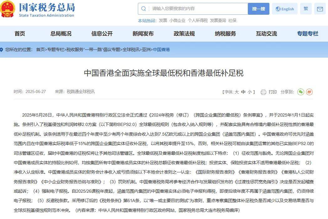 值得注意的是,香港已于2025年1月1日起实施全球最低税及香港最低补足税。这主要针对大型跨国企业集团(综合收入达7.5亿欧元或以上),旨在确保其在每个运营地的有效税率不低于15%。