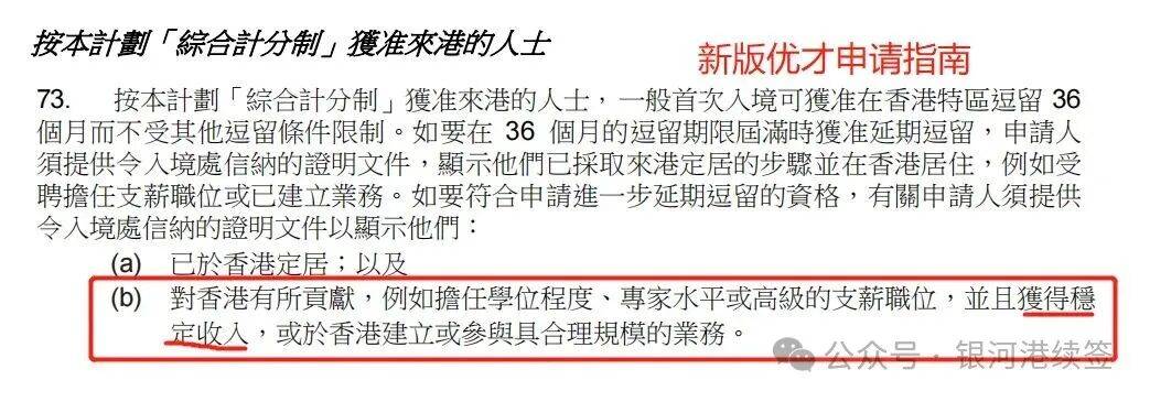新一版优才计划的续签条件中加入了“稳定收入”这四个字,明确了优才续签的审核标准,入境处会综合考虑续签申请人的薪酬福利、经济贡献和留港时间。