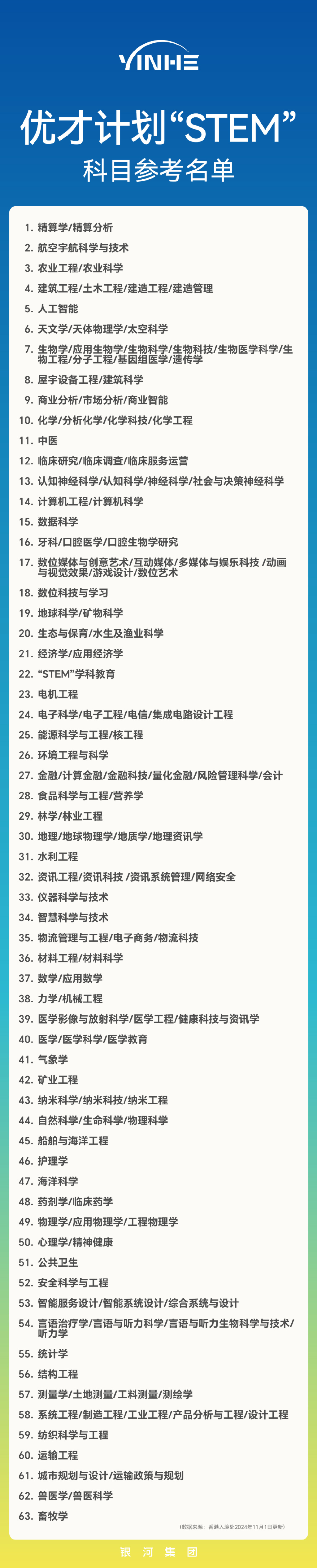 STEM专业:上述学位需属于科学、技术、工程、数学领域,如人工智能、数据科学、生物科技等63个指定学科,需提供成绩单及课程描述证明。