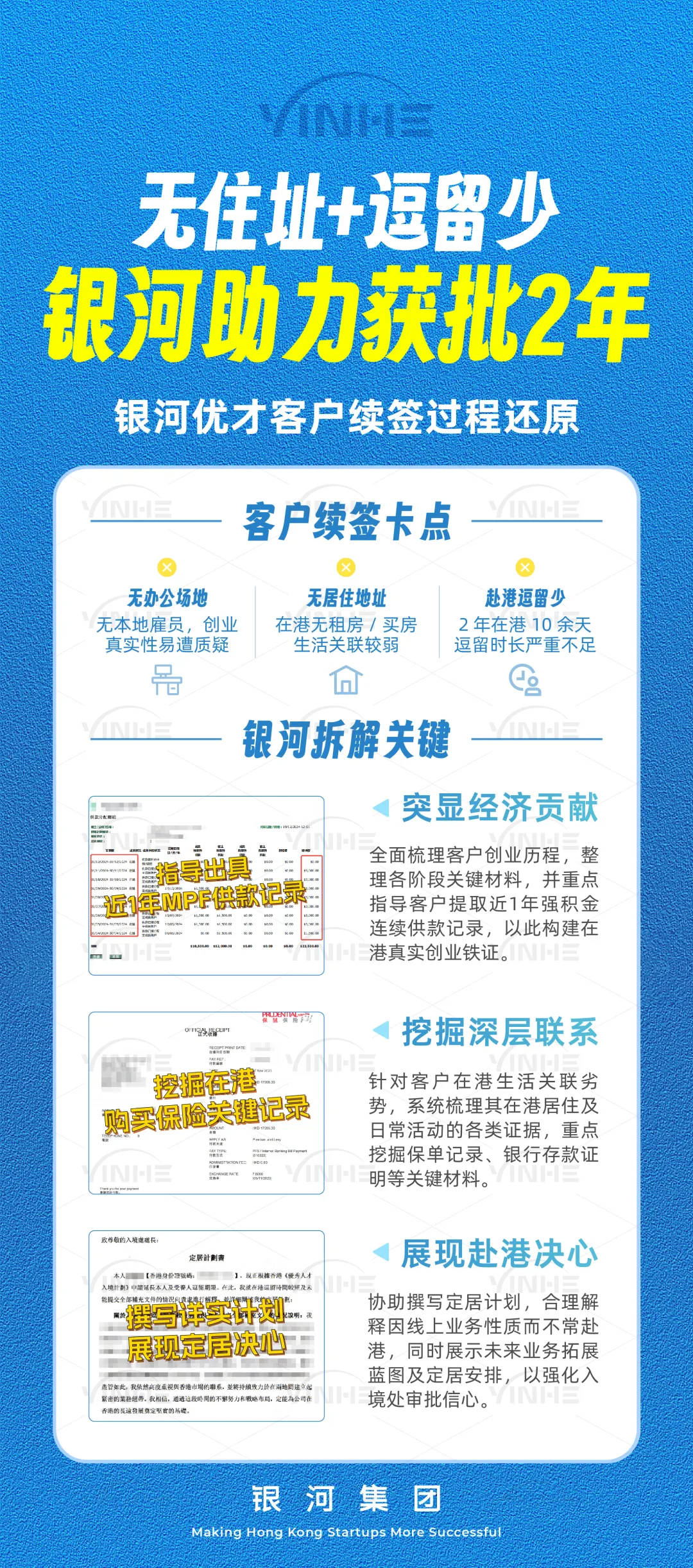 客户优才获批1年内就火速创业,在港公司业务真实经营,并在香港购置方案作为居住地址证明。银河续签服务团队110个服务节点动态跟进,协助梳理全套文书,让其香港公司真实经营有据可依,并且客户在港购置的房产,印花税/存款等强关联证据清晰,续签竞争力倍增,一次顺利续签3年。