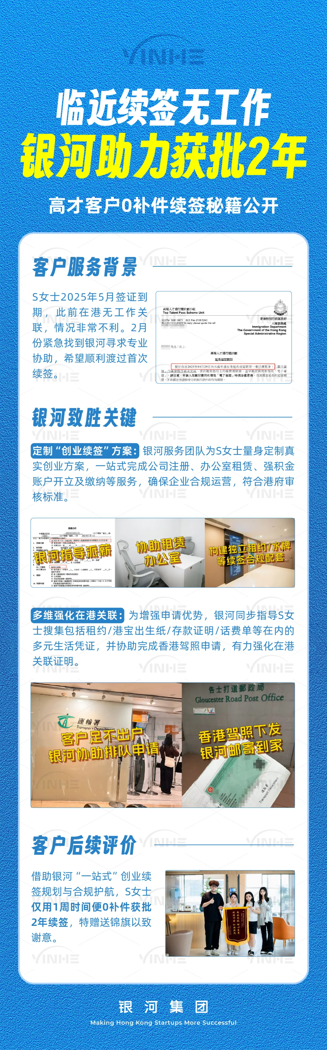 ✅定制“创业续签”方案:银河服务团队为S女士量身定制真实创业方案,一站式完成公司注册、办公室租赁、强积金账户开立及缴纳等服务,确保企业合规运营,符合港府审核标准。