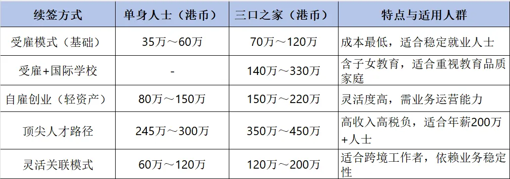 签证费:1300港币/人/次 三口之家总费用:(600+1300)×3人×2次 = 11,400港币 顶尖人才续签模式,一次续签6年(在港居住≥2年且上年度薪俸税收入≥200万港元): 三口之家总费用:(600+1300)×3人×1次 = 5,700港币 记住哦,目前香港入境处对高才续签的批复并不是固定批3年,而是根据申请人的综合情况相应批复续期,除顶尖人才外最长续签时间不超过3年,因此准备越充分,减少续签次数,不仅有效降低断签风险,也能节省支出成本。 2、高才不同续签方式成本分析 ①在港受雇模式(成本最低) 强积金(MPF):雇主与雇员各缴纳5%,月薪≥2.3万港元者年缴27,600港元。 薪俸税(以年薪50万港币为例):按照香港的税收减免政策计算,每年需要缴纳0-35000港币不等。 7年成本估算:20~35万港币(不含生活开销) ②自雇创业模式(中等成本)