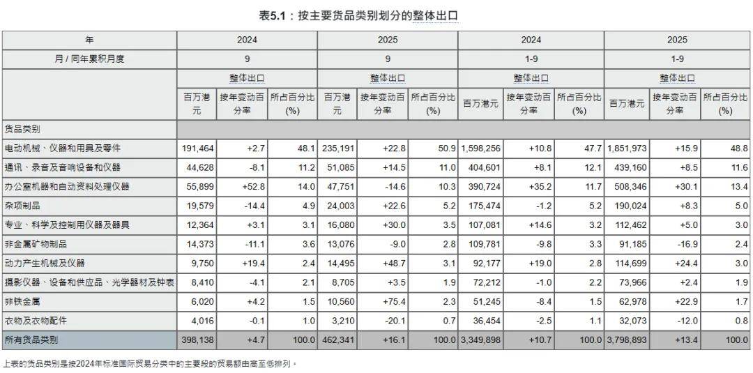 根据香港贸易数据,办公室机器和自动数据处理仪器是出口的绝对主力。2025年前9个月,该类产品出口同比增长30.1%,为出口增速最快行业。