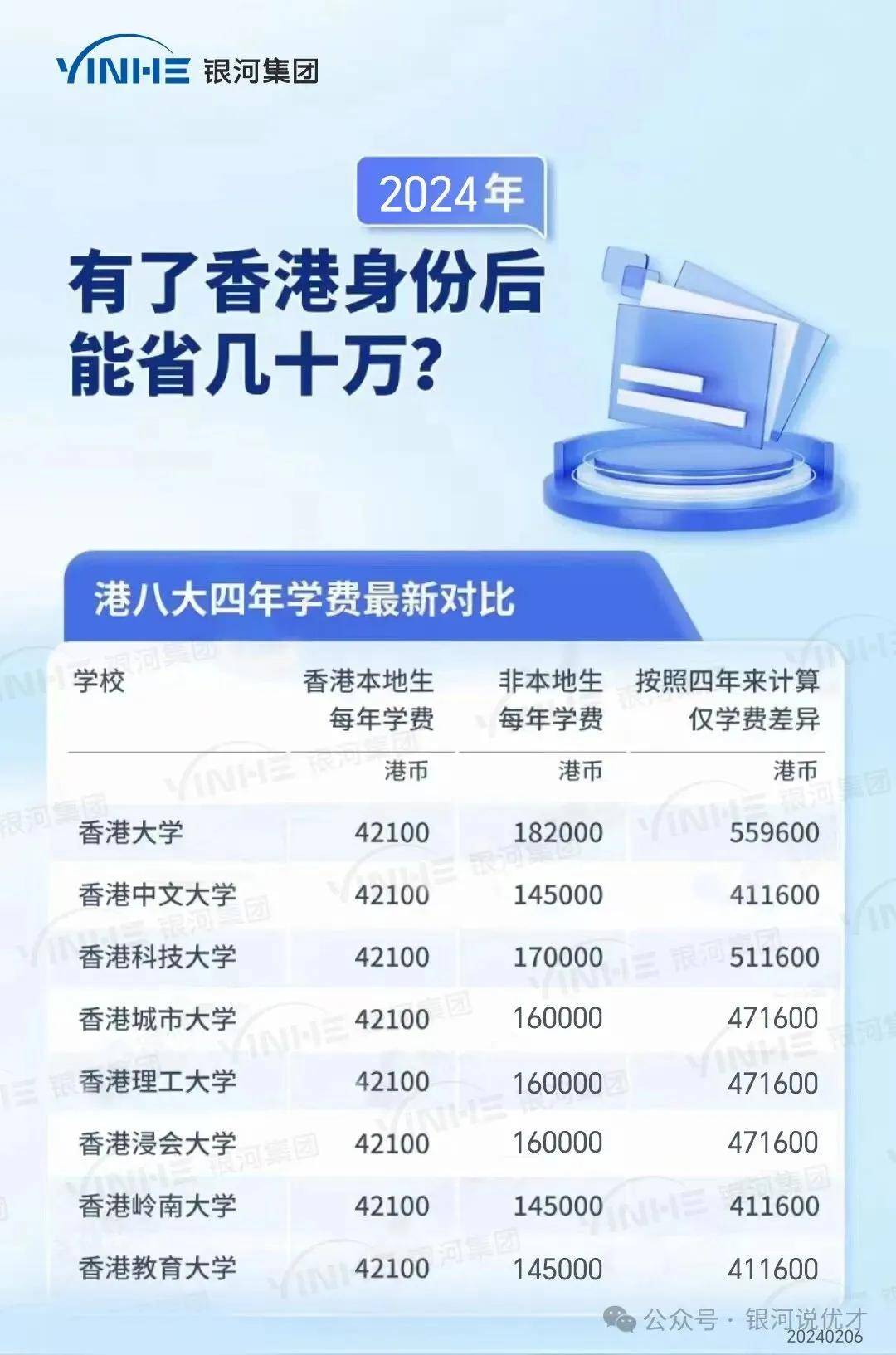 相比内地国际学校每年20-40万的学费,香港公立学校几乎免费,私立学校学费也仅为内地的 1/2-2/3;同时,香港高校本地生学费仅为非本地生的 1/4,以香港大学为例,本地生每年学费约4.2万港币,非本地生则需22万港币,4年下来可节省近70万港币。