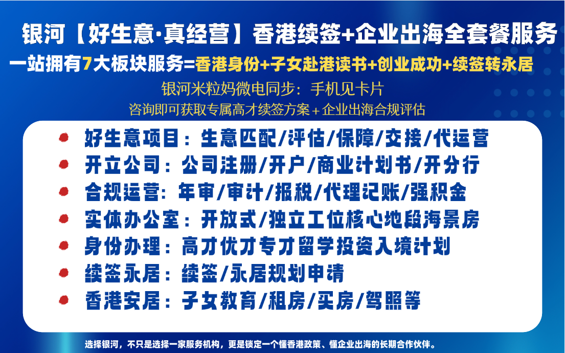 银河【好生意·真运营】 高才创业续签一站式服务,续签永居规划、公司注册开户、后续运营维护全都交给银河集团。详细可以加银河米粒妈微信咨询【手机见卡片】