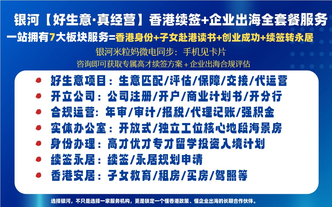 选择银河,意味着您选择的不仅是一个服务机构,更是一位深度理解香港入境政策、商业环境与续签核心的长期伙伴。 我们通过 “好生意·真经营” 的务实路径,助您真正扎根香港,实现身份到手、子女赴港读书、创业成功、顺利续签直至获得永居的完整闭环。
