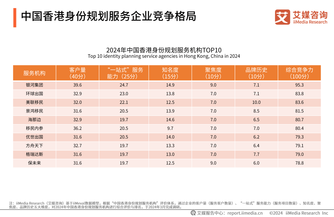 去年,全球新经济产业第三方数据研究机构艾媒咨询(iiMedia Research)发布了《2024年中国香港身份规划服务市场发展研究报告》,公布了香港身份规划服务机构的Top10榜单。