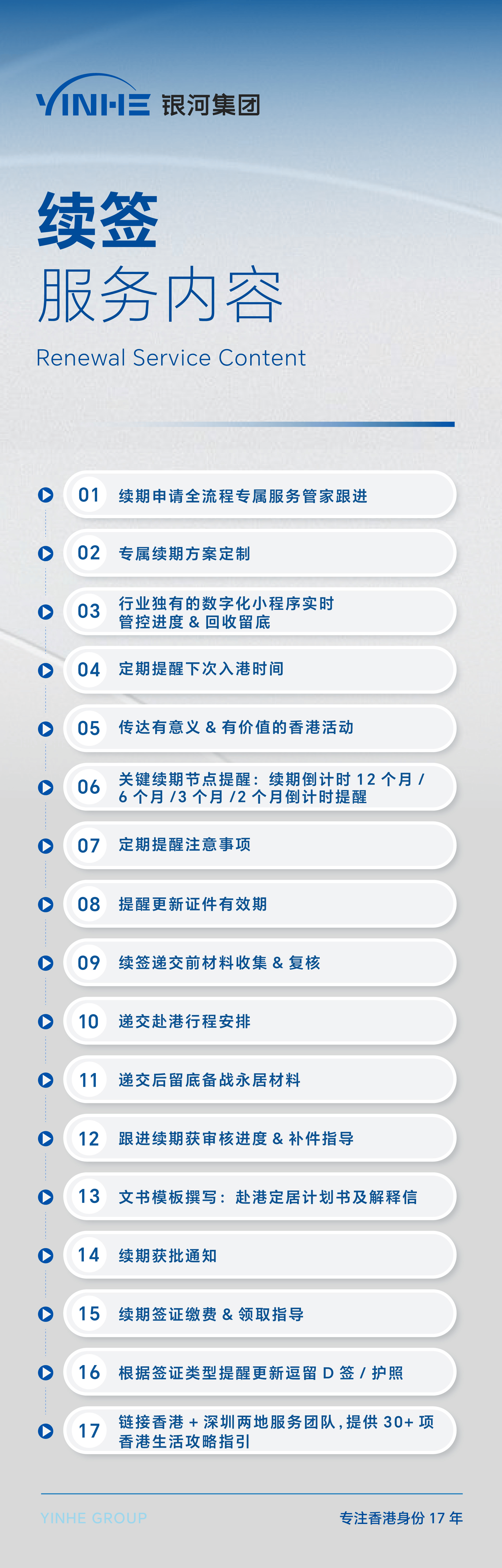 如果你不知道如何做,建议找银河集团(18681542289/19065101539)协助你,银河会为你们规划续签方案,例如需要准备哪些针对性的续签材料,如何操作等。会根据你的实际情况进行协助规划,提前提醒,和做解释声明及未来计划等,并且能提供多项赴港生活的后续服务。