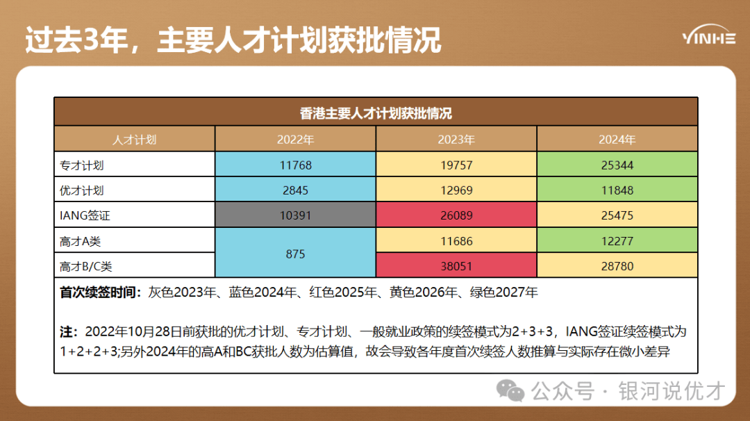 香港主要人才政策(优才、高才通、专才、IANG签证计划)在2022年底-2024年三年期间获批人数剧增,已经超过27万人,根据这些人才政策首次签证期限2年或3年来推算,2022年和2023年获批香港身份的朋友,2025年正在面临第一次续签,而2026年和2027年都是续签高峰期。