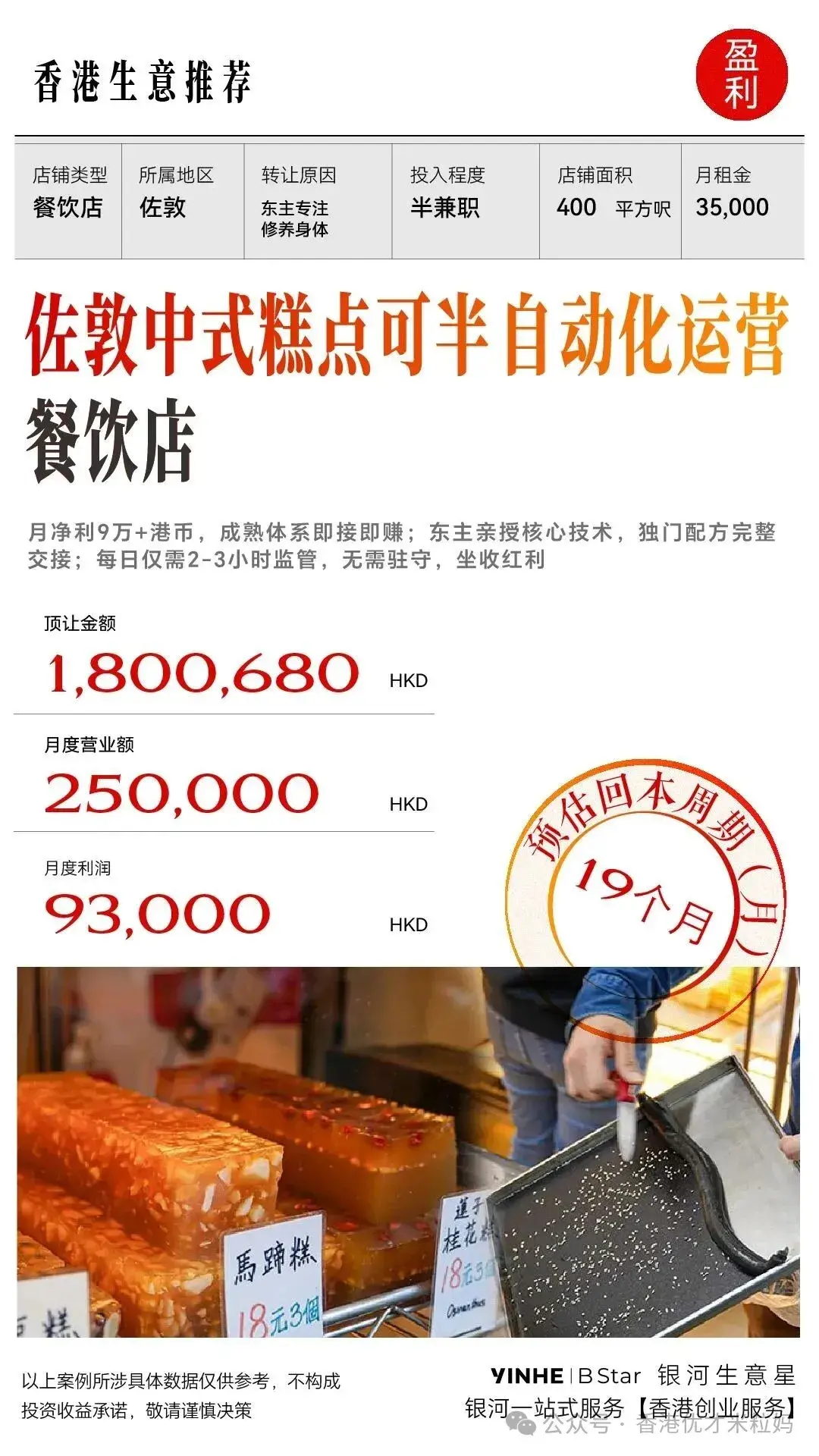 这家仅37.4平方米(400呎)的甜品店,每月营业额达25万港币,月利润超9万港币,14个月即可回本。若按7年续签周期计算,剔除顶让费后,可为客户带来617万港币的净利润,实现“身份+盈利”双重收获。