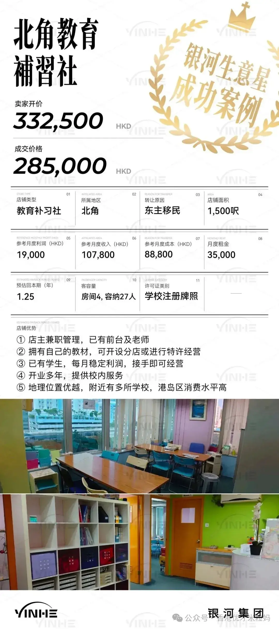 实地考察时,客户与原东主在教育理念上高度契合,相谈4小时后当场拍板。东主初始开价33万港币,经银河协调,最终以28万成交。该补习社的稳健利润、自有教材体系及周边多所学校的优越地理位置,为客户后续开分店奠定了坚实基础,也为身份续签提供了稳定保障。