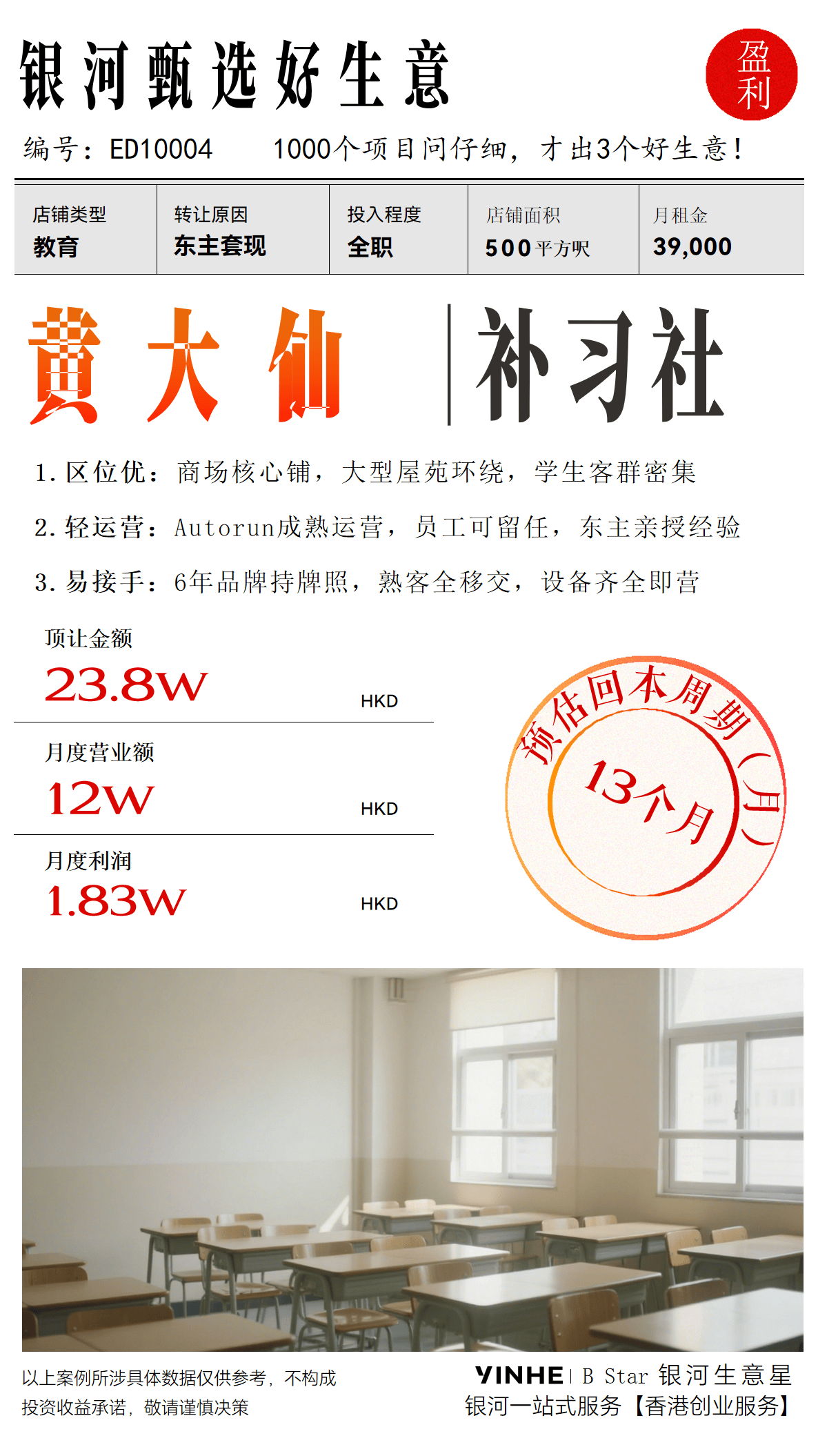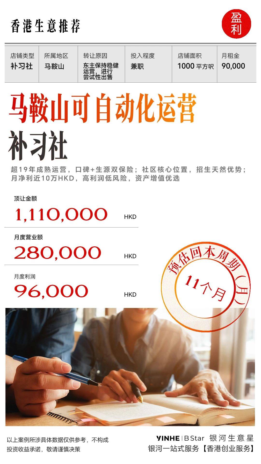 该补习社位于马鞍山,具有超19年成熟运营经验,口碑和生源双保险。店铺处于社区核心位置,具有招生天然优势。顶让金额为111万HKD,月度营业额达28万HKD,月度利润为9.6万HKD。预估回本周期为11个月。