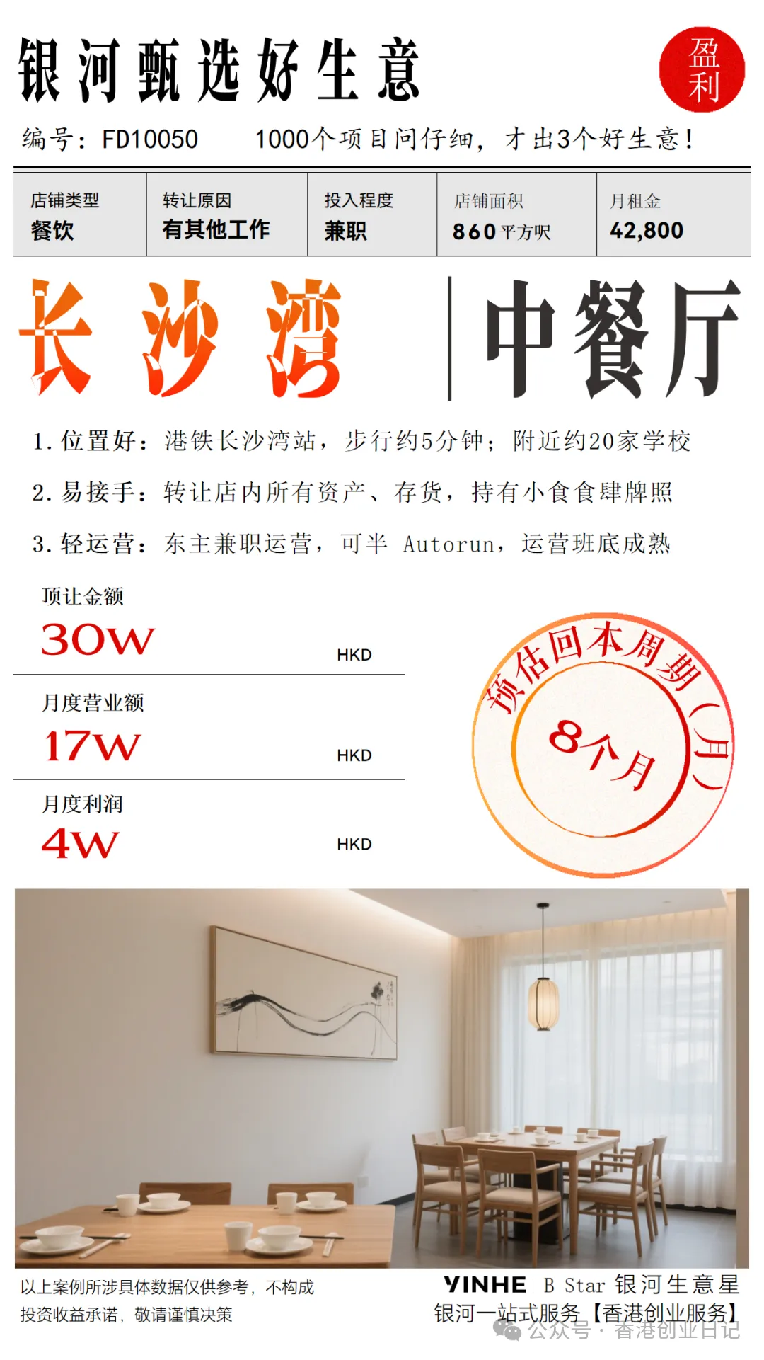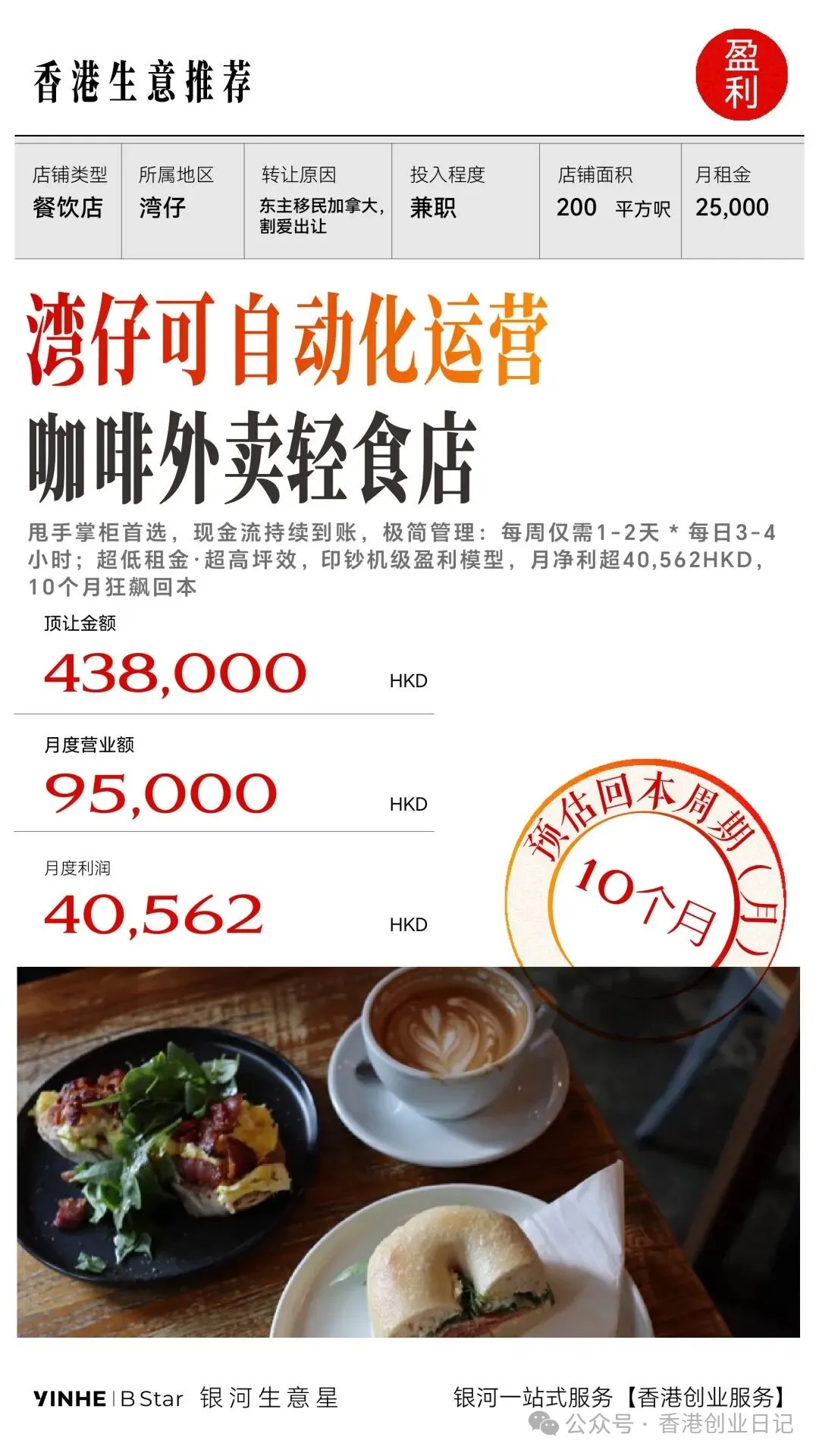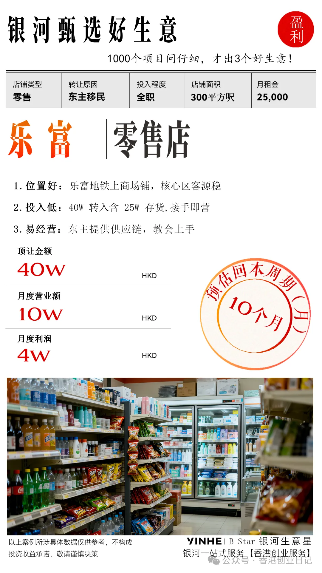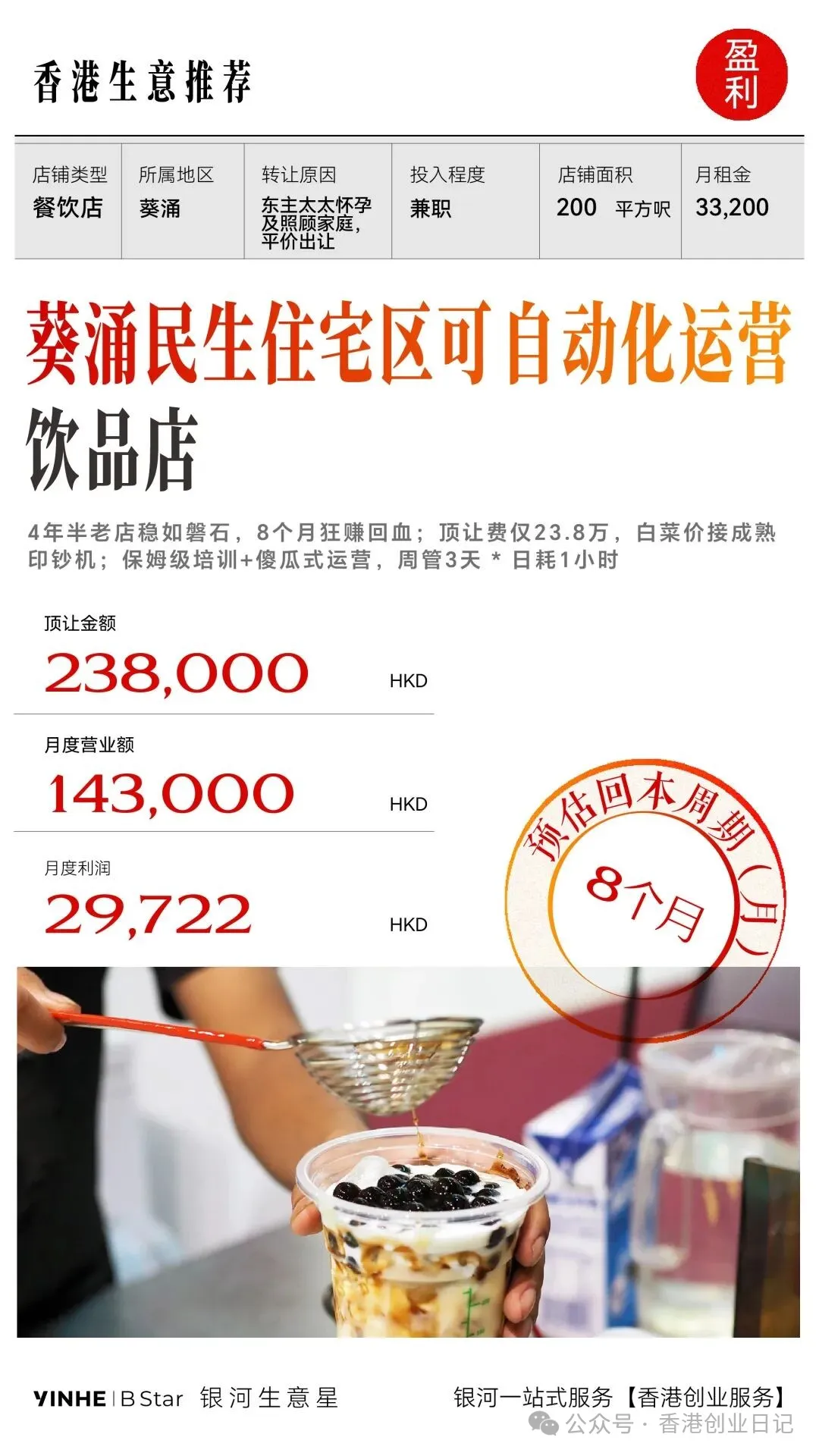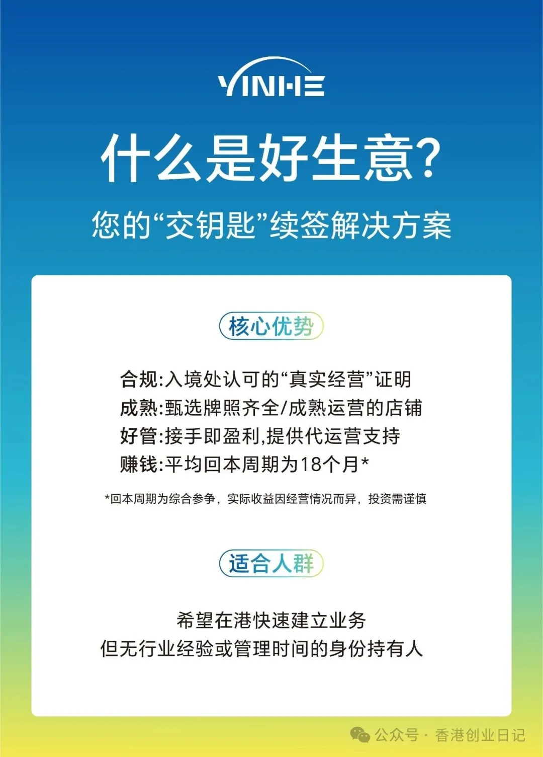 在香港盘店铺做生意,既有着税收、贸易等多方面政策优势,还能收获快速运营、助力身份续签等实际好处,而且成本较低,可以实现轻资产创业。 那么内地人如何在香港收购一家店铺做生意呢?咱们这篇攻略都给你讲清楚! 一、收购香港店铺创业的优势分析 1、运营模式灵活:盘个店铺创业可以借助原有店铺的地理位置、现有设备、熟客资源和即时的现金流,实现“开门即营业”。这种方式省去了前期市场培育的“爬坡期”,降低了创业风险。同时,香港的商业环境灵活多变,创业者可以根据市场需求和竞争态势,及时调整经营策略,保持企业的竞争力。 香港注册公司、开店做生意,可通过下方链接测评个人创业规划评估,只需10s就能了解知晓结果,后续会有资深创业顾问详细分析: https://pages.galaxy-immi.com/evaluation/52?pla=yes-gw-yinhecy&spreadword=202512031 2、低税减负:利得税标准税率为16.5%,利润不超过 200 万港币的小型企业税率低至8.25%,且无增值税、资本利得税等,境外收入还可免税,能有效降低税务负担。 3、国际化营商环境:香港作为国际金融、贸易和航运中心,拥有高度发达的基础设施和专业化的服务体系。其国际化程度极高,为企业拓展海外市场提供了得天独厚的条件。在香港创业,可以接触到来自世界各地的客户和合作伙伴,提升企业的国际影响力。 4、资金自由:银行体系发达,资金自由流动,无外汇管制,任何货币都可自由兑换,便于跨境支付和国际贸易结算,融资渠道也十分丰富。 5、法律保障:法律体系与国际接轨,营商环境透明,商业合同受法律保护,产权清晰,交易公平,创业者可安心发展业务。 6、节省时间和精力:香港开店涉及牌照申请、消防验收、租赁合同备案等繁琐流程,而顶让的成熟店铺大多牌照齐全、合规经营,接手即可营业。少则1-2周就能启动,比新店筹备节省3-6个月的时间和精力。 7、助力身份续签:对于通过香港优才、高才通等计划赴港的人士,在香港创业自雇是续签的最佳选择之一,续签通过率高、港府更支持。还可在7年后申请香港永久居民身份。 想去香港盘个店铺做生意的老板们,不妨考虑银河集团,能提供从店铺项目匹配、尽职调查到后续运营支持的一站式服务,包括公司注册、银行开户、年审等基础配套服务,助力创业者轻松创业,如有意向欢迎咨询(电话/微信:17319271820): 二、推荐哪些香港生意? 在香港,以30万到50万港币左右的预算盘店铺创业,可考虑以下几种生意类型。 1、特色咖啡/茶饮店 香港茶饮市场活跃,采用“线下+外卖”模式可降低租金压力,适合预算有限且希望快速进入市场的创业者。 2、轻食快餐店 健康沙拉、三明治等轻食适合中环等商务区,需求稳定且运营成本相对较低。此类店铺可依托人流密集区域实现高效周转,契合健康饮食趋势。 3、进口商品店(小型规模) 利用香港零关税政策,引进日本药妆、欧洲母婴产品等热门品类。小型店铺可通过精选SKU控制成本。 4、跨境电商服务点 依托香港物流优势,提供跨境选品、代运营等服务。此类生意无需大量库存,通过线上平台即可开展业务,适合资源整合能力较强的创业者。 5、夹娃娃机店 香港夹娃娃机市场一直有从业者在经营,夹娃娃机在当地一般叫做夹公仔机。一些店铺通过设置在人流量大的商场、街边等位置,吸引了不少消费者,尤其是年轻人和游客。风险小、回本周期短,每周派一人去店里做清洁、兑币、补货工作即可。 6、自助洗衣店 近年来,香港自助洗衣店行业发展迅速,据香港洗衣商会透露,自助洗衣店在高峰期多达数百间。虽然近两年增长速度有所放缓,但在香港多区仍然能够见到无人洗衣店的踪迹。 7、补习社 香港教育培训市场需求旺盛,教育补习社遍布全港各区,从基础的课后功课辅导到各类专业技能培训,应有尽有。 8、面包店 在香港城市里随处可见,深受市民及游客的喜爱。一些传统面包店凭借经典的面包制作工艺和口味,拥有稳定的顾客群体;同时,也有一些新兴的面包店通过创新产品和营销方式,吸引了年轻消费者。 哪个香港生意适合自己?点击下方链接测评个人创业规划评估,只需10s就能了解知晓结果,后续会有资深创业顾问详细分析: https://pages.galaxy-immi.com/evaluation/52?pla=yes-gw-yinhecy&spreadword=202512031 三、香港店铺生意回本周期大概多久? 香港店铺的回本周期受行业、地段、经营模式影响较大,整体来看盘下成熟店铺的回本周期多集中在 6 - 18 个月,而重运营品类入连锁火锅店则多在 1 - 2 年心商圈的轻资产、自动化运营店铺,往往是回本速度最快的选择。 基于银河集团的筛选标准,我们为您推荐以下几类优质店铺,涵盖了顶让金额、月度营业额、回本周期(预估)等。 【乐富|零售店】 ●地铁上盖商场黄金位置,直面日常庞大客流。 ●东主全程扶持:提供供应链、教学运营。 ●零售刚需,客源稳定,接手即经营。 预计回本周期:10个月 【旺角|宾馆】 ●旺角核心地段:步行5-8分钟到地铁。 ●全自动化管理:密码锁+监控,远程运营。 ●长租模式稳定:2013年老店,合规安全。 ●清洁可外包,轻松省心。 预计回本周期:10个月 【长沙湾|中餐厅】 ●近20所学校,学生客源稳定。 ●无需专业厨师,烹饪简单易上手。 ●资产齐全,接手即可营业。 ●无直接竞争,可拓展外卖提升营收。 预计回本周期:8个月 【上环|补习社】 ●月赚3.7万HKD,日均6小时轻松运营; ●十年老校
