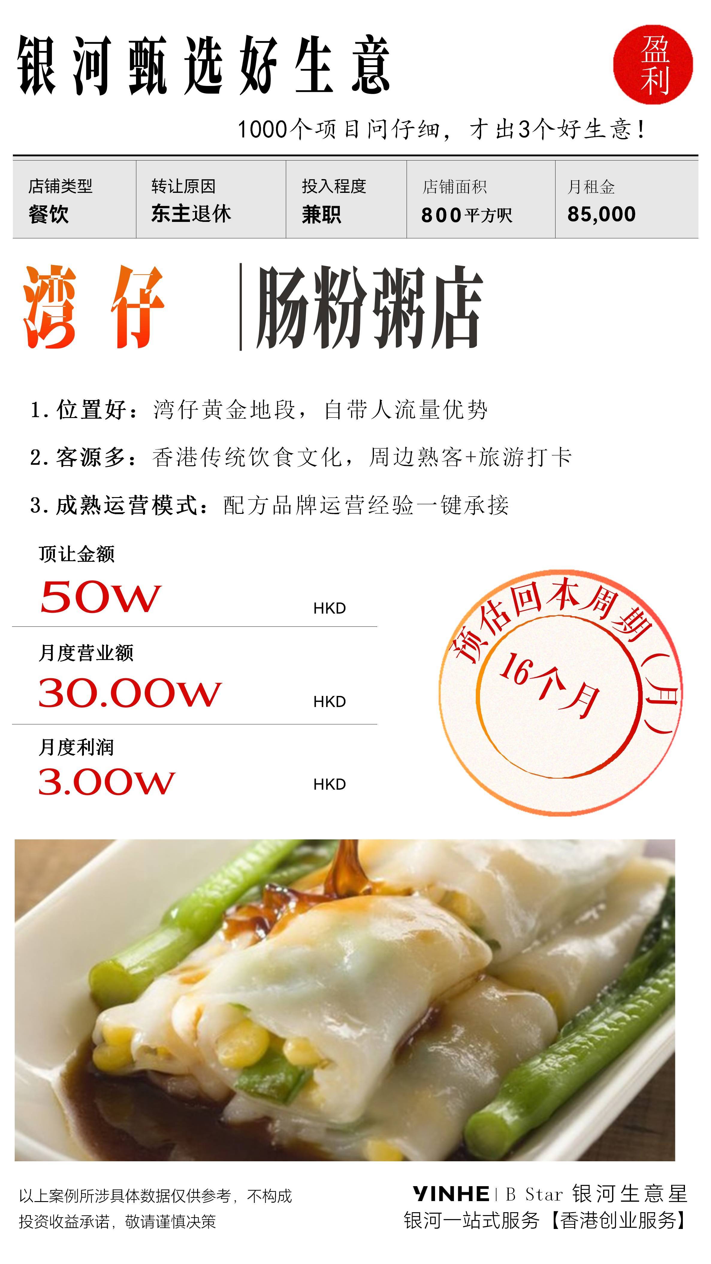 顶让金额 50 万港元,月租 8.5 万港元,月度营业额 30 万港元,月度利润 3 万港元