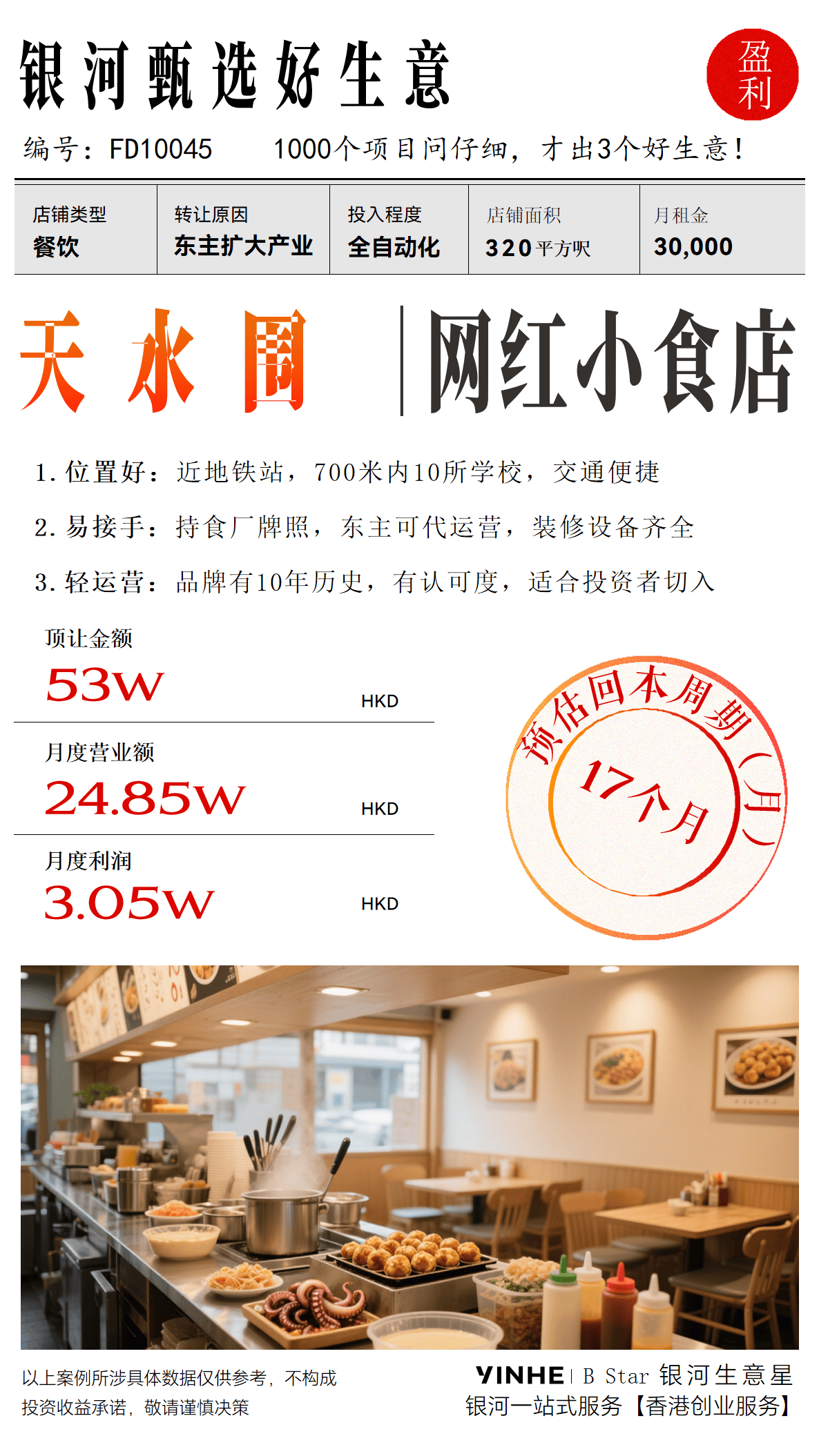 顶让费53万港元,月营业额约24.85万港元,月利润约3.05万港元