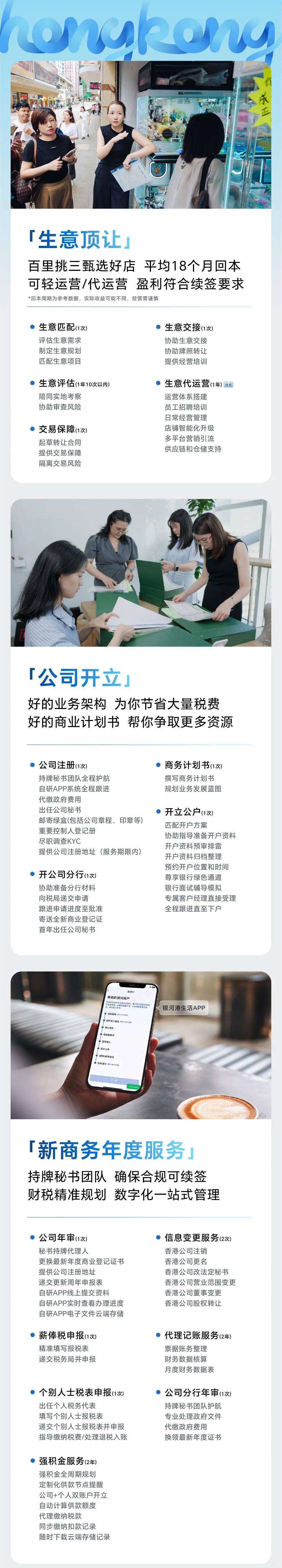 想去香港盘个店铺做生意的老板们,不妨考虑银河集团,能提供从店铺项目匹配、尽职调查到后续运营支持的一站式服务,包括公司注册、银行开户、年审等基础配套服务,助力创业者轻松创业,如有意向咨询银河(17319271820):