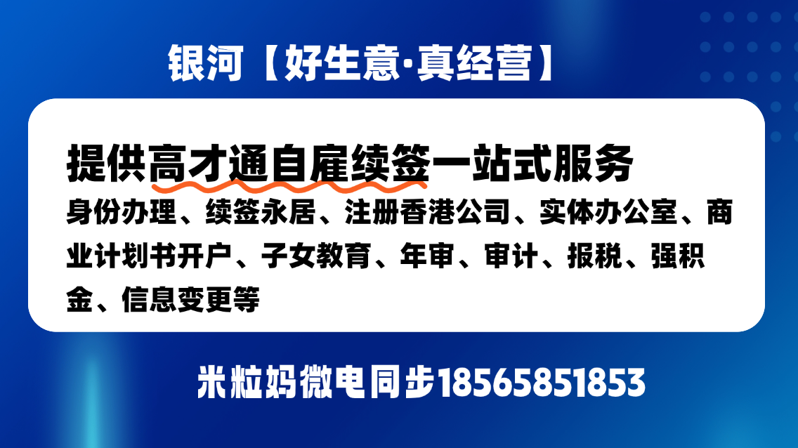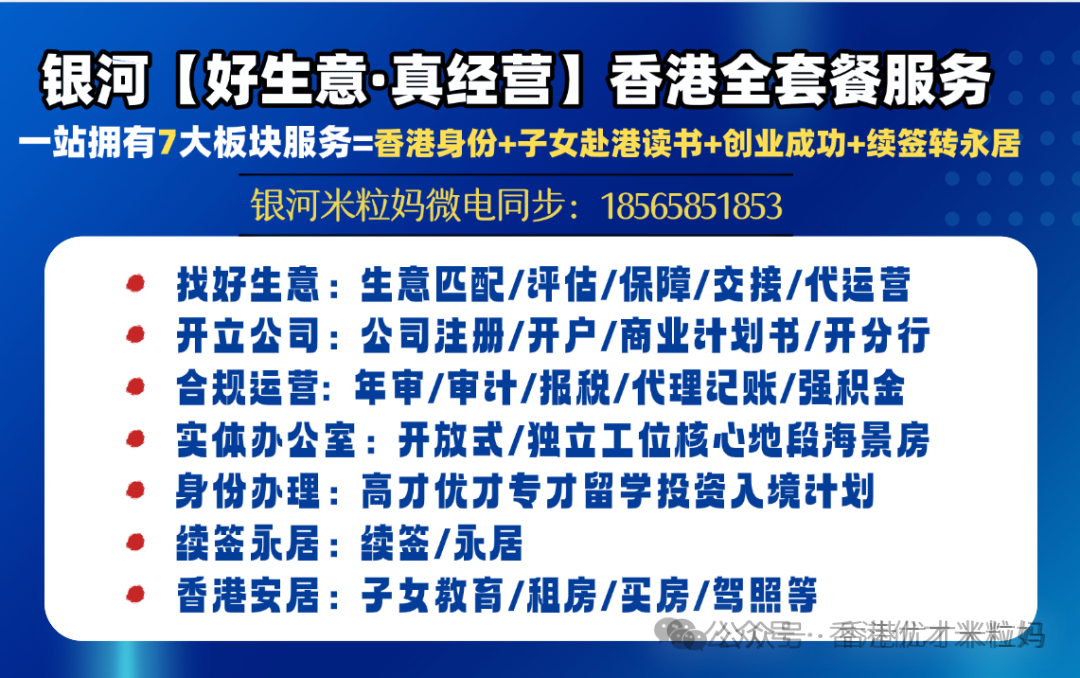 香港身份办理、创业和续签都找银河集团,从香港身份办理、选项目、收购店铺、租赁办公室、到后期招人、商务服务、公司代理运营管理,续签和永居手续办理, 银河集团全都帮您搞定。选银河不仅是选一个服务机构,更是选一个懂香港、懂创业、懂续签的长期伙伴!银河【好生意·真经营】=身份到手+创业成功+顺利续签转永居。想要了解银河集团【好生意·真经营】项目可以加银河米粒妈微信详细沟通(18565851853&17675416895)