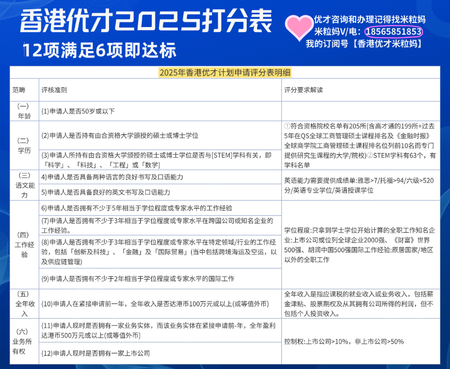 2025香港优才计划打分标准自测表|最新政策+评分细则详解(12月更新)