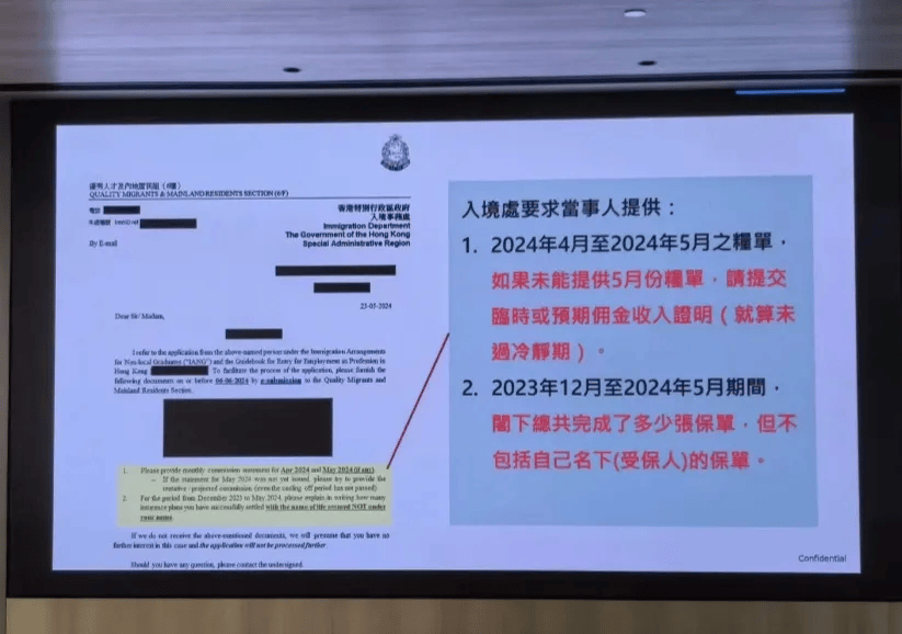 之前就有走保险过续签的IANG申请人,收到了入境处这样的续签批复:要求补充提供近1个月的佣金收入证明、说明过去在职期间完成了多少张保单、有多少保单受保人不是自己。