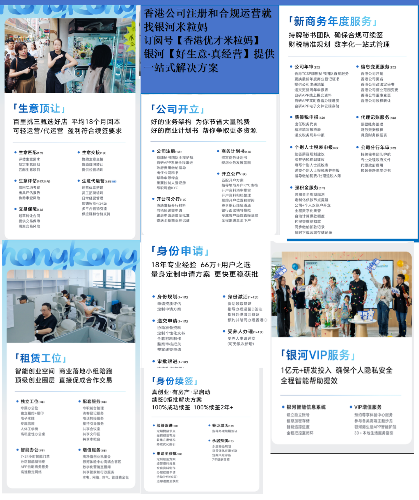 银河【好生意·真经营】提供香港身份续签、转永居、注册香港公司、开户、商业计划书、公司财税合规运营(年审审计报税等)、强积金、信息变更、税务规划、租赁实体办公室、子女教育全链条服务,如需咨询欢迎随时DD银河米粒妈(18565851853 &17675416895)