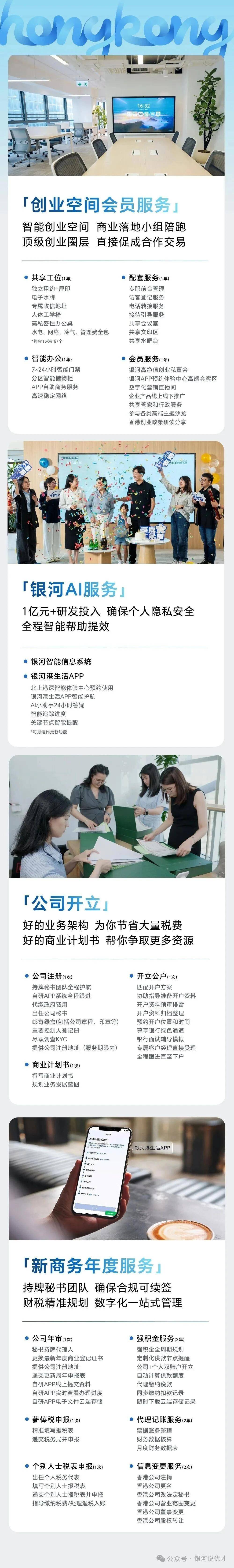 银河集团提供一站式香港创业服务套餐,涵盖香港公司注册、顶让生意、银行开户、税务规划及申报、强积金申报、公司年审、审计、代理记账、办公室租赁等,不管你在香港是否有公司、是否有业务、是否有身份,找银河(17319271820)匹配适合您的服务: