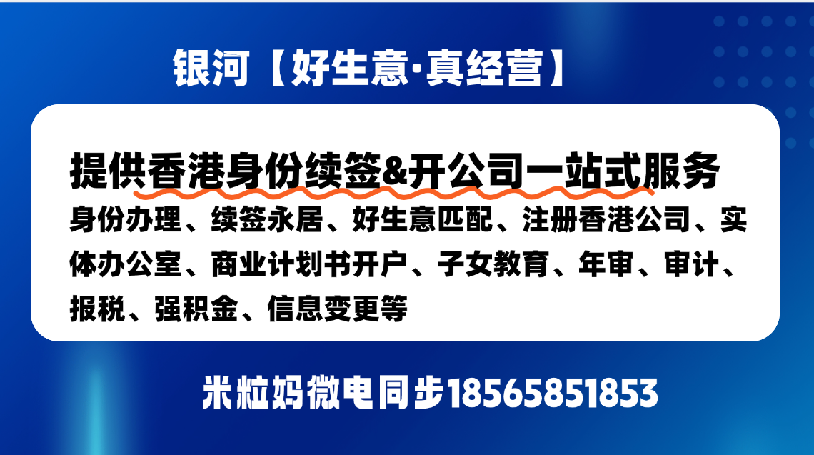 银河【好生意·真经营】提供香港身份续签、转永居、注册香港公司、开户、商业计划书、公司财税合规运营(年审审计报税等)、强积金、信息变更、税务规划、租赁实体办公室、子女教育全链条服务,如需咨询欢迎随时DD银河米粒妈(18565851853 &17675416895)