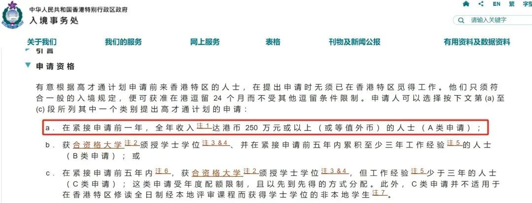 高才A类申请面向的是高收入群体,对学历和年龄没有硬性要求。其核心条件是,在紧接申请前一年,全年收入达港币250万元或以上(或等值外币)。