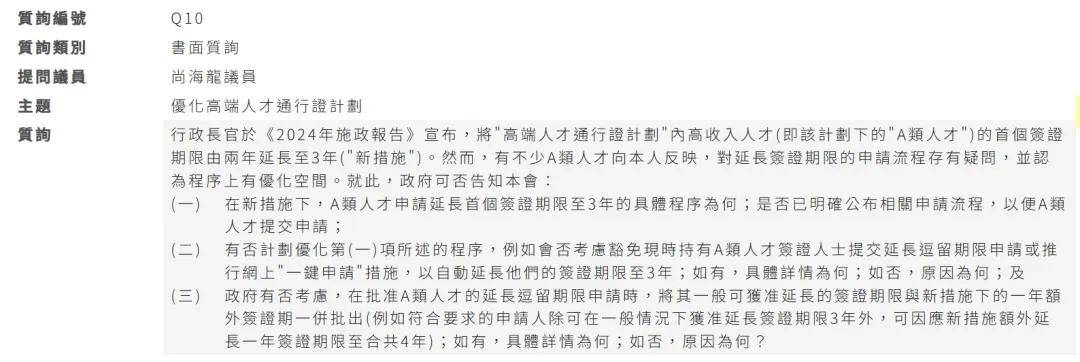 有议员在立法会议上提出,是否可以豁免这2.1万宗2年期高才A类申请的延期申请,或者在申请平台上推出“一键申请”,简化延期程序。对此,香港劳工及福利局局长孙玉菡明确表示: