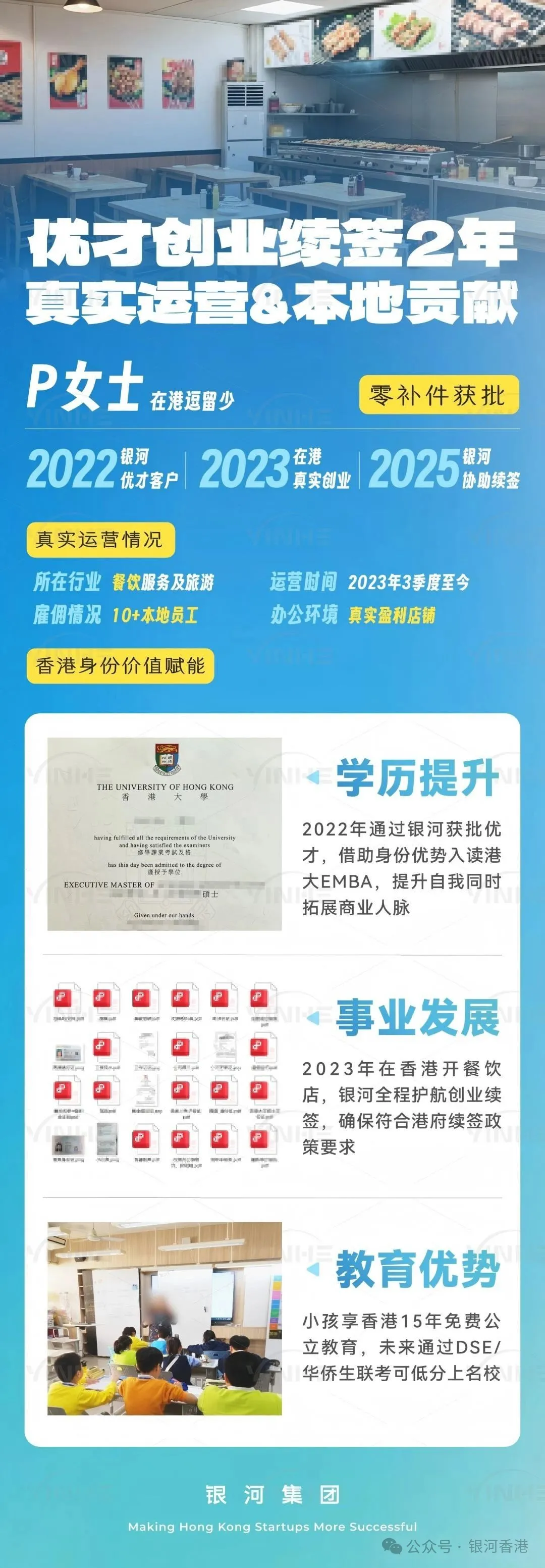 银河为P女士其定制创业续签黄金方案,助力其拿到永居,凭借身份优势入读港大EMBA,协助其在香港创业: