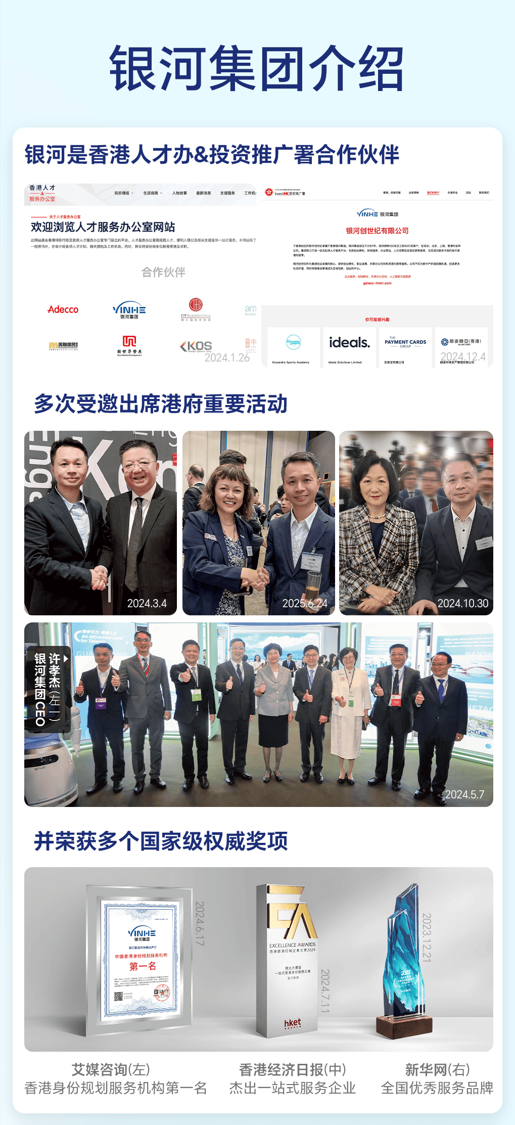 银河集团总部位于深圳,并在北京、上海、香港设立分公司,作为香港特区政府人才服务办公室合作伙伴,银河集团多次受邀参与官方活动,其专业性与可靠性得到港府高度认可。此外,银河集团还荣获新华网“2023年全国优秀企业服务品牌”、iiMedia Research“2024年中国香港身份规划服务机构TOP10榜单”首位等荣誉,行业地位举足轻重。