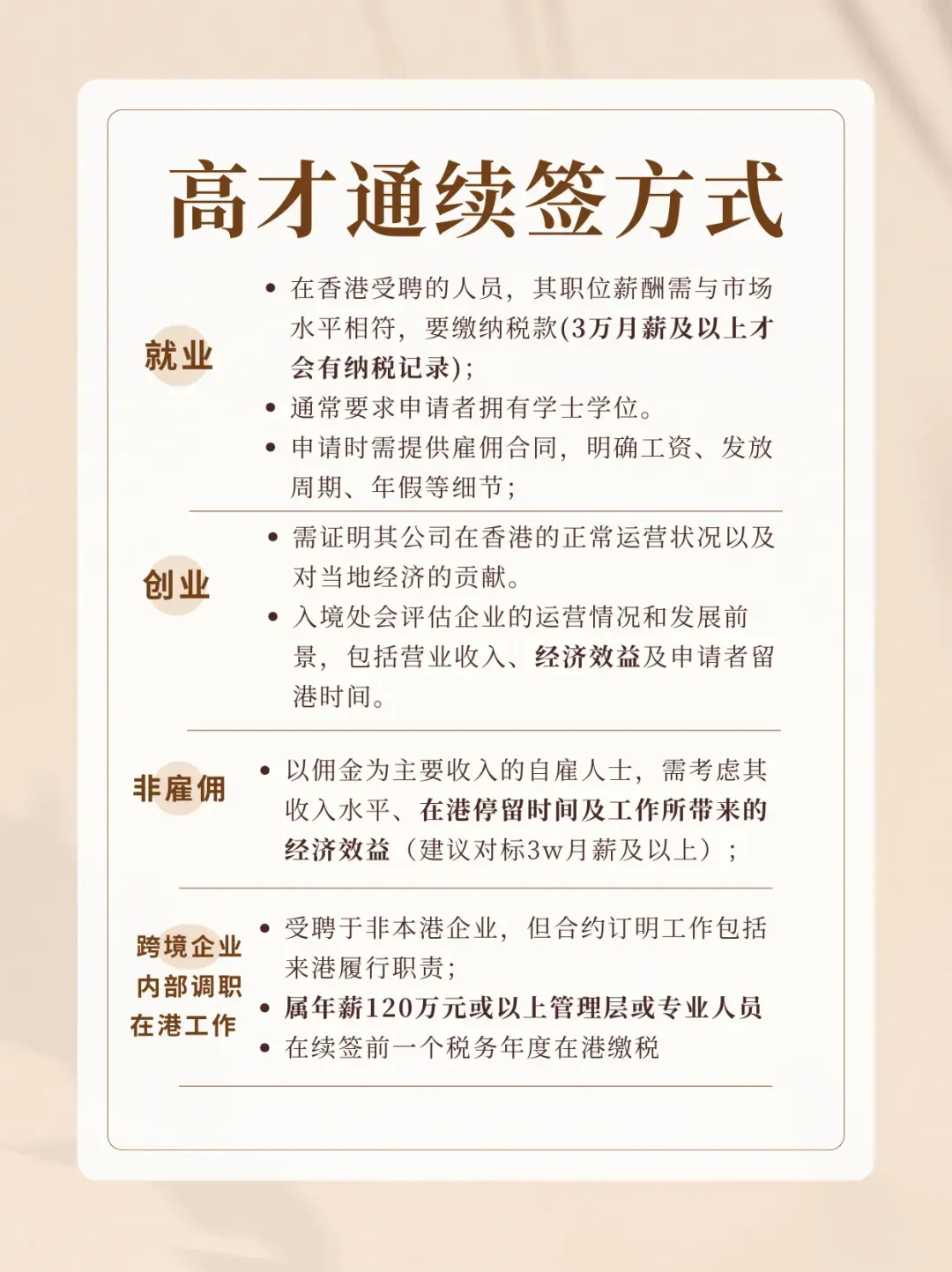 就业续签:指申请人获得香港本地公司雇佣,并且满足持有人所持学位同等岗位+市场水平的薪酬+在香港缴税+一定留港时间等。