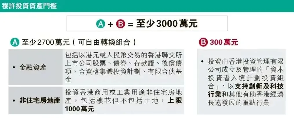 投资:在递交申请前的6个月内,或在获批后的6个月内,把不少于3000万港币投资在指定投资资产类别(股票、债券、存款证、后偿债项、合资集体投资计划、有限合伙基金,或非住宅房地产等)中。