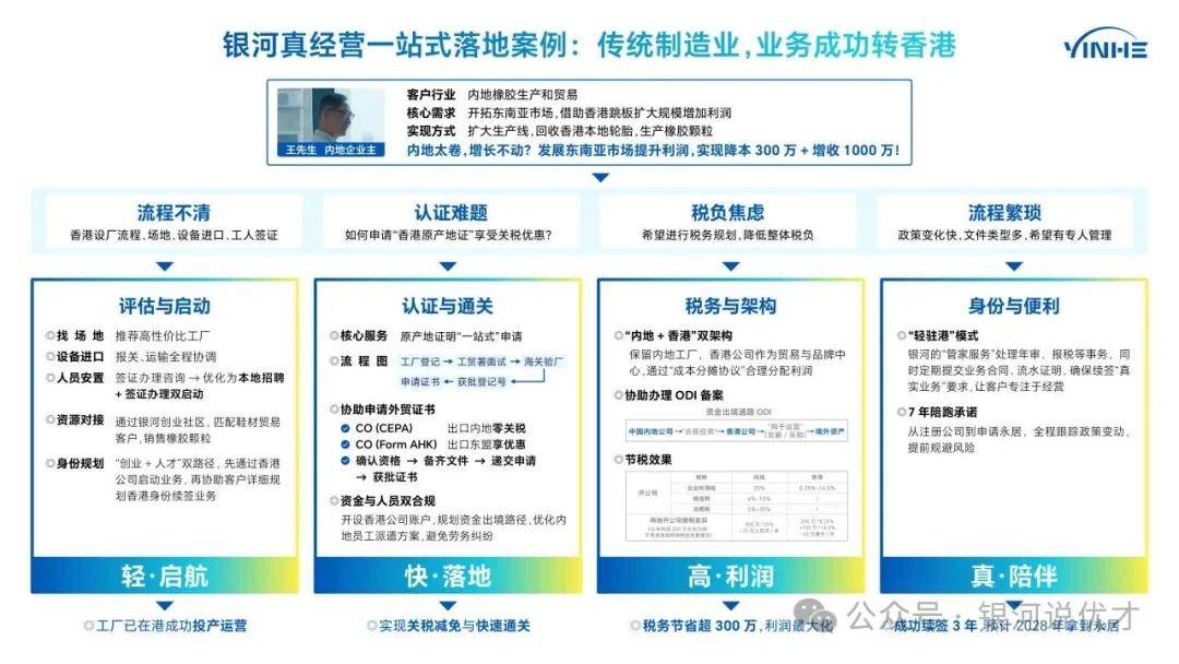 比如下面这位王先生,做贸易生意,通过银河真经营制定香港创业一站式落地方案,税务节省超300万,利润最大化,同时还成功续签了3年香港身份,可谓是一举两得!
