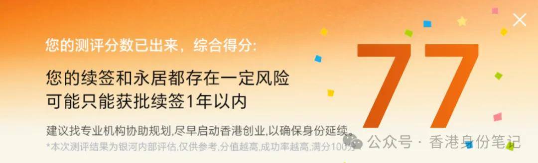 要续签香港身份的朋友们,可以先根据自身情况测评下续签通过率如何,低于60分就比较危险,要尽快做好行动方案↓↓↓或者咨询银河集团获得一对一续签指导(电话同微:17319271820):