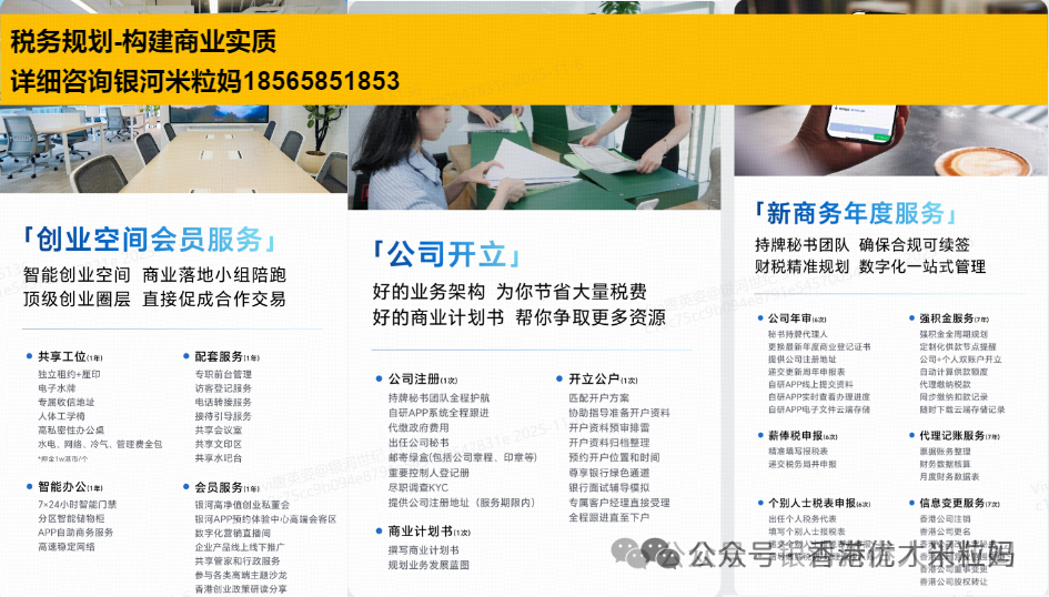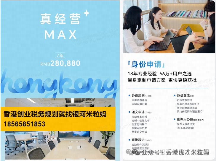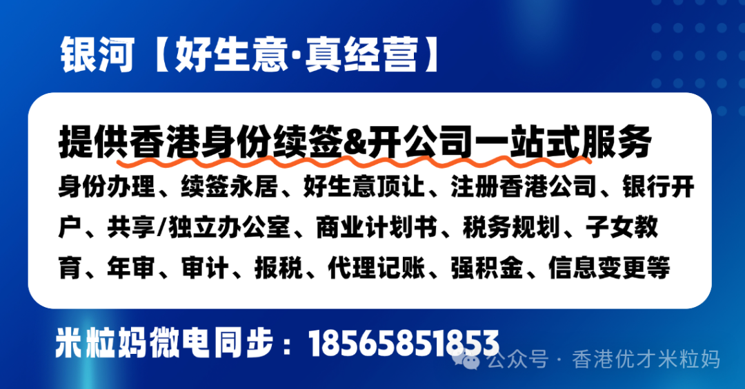 银河【好生意·真经营】提供香港身份续签、转永居、注册香港公司、开户、商业计划书、公司财税合规运营(年审/审计/报税/代理记账/强积金等)、税务规划、实体办公室、子女教育全链条服务,如需咨询欢迎随时DD银河米粒妈(18565851853)