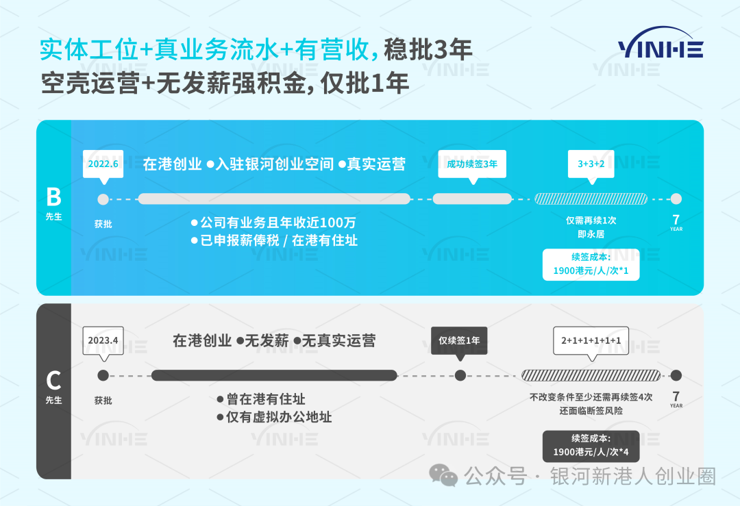 失败警示案例:另一申请人仅注册公司却无实体工位,未开展真实业务、无营收流水,也未雇佣员工及缴纳强积金,属于典型空壳运营。虽未直接拒签,但审批方仅给予1年短期续签,且明确告知需在有效期内完善运营体系,否则后续续签将面临拒批风险。两者对比可见,实体运营与合规凭证是高才续签稳批长年限的核心保障。