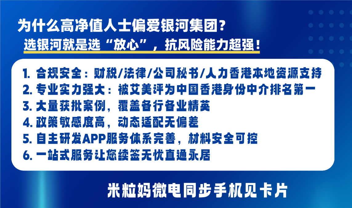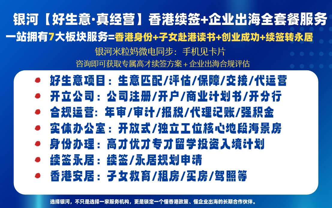选择银河,不只是选择一家服务机构,更是锁定一个懂香港政策、懂企业出海的长期合作伙伴。现在咨询,即可获取专属高才续签方案 + 企业出海合规评估!如果你想要了解银河【好生意·真经营】可以加我微信详细了解(手机见卡片)