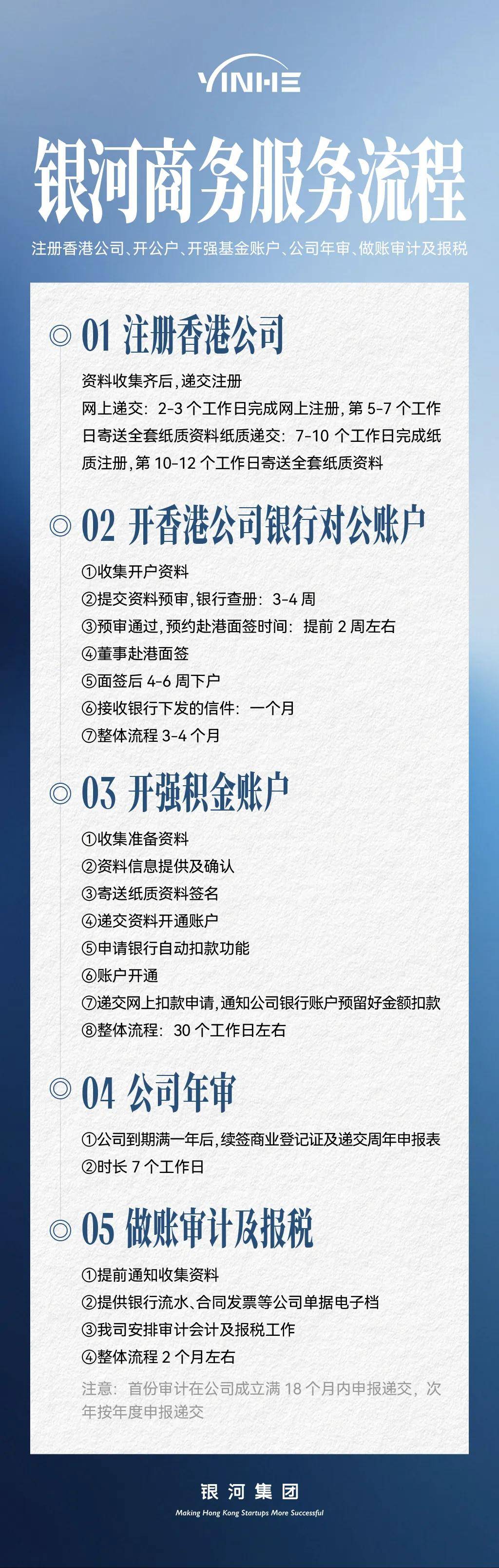 银河集团整合 “公司注册 - 办公地址 - 年审 - 审计 - 报税 - 强积金 - 银行开户 - 信息变更”等全链条服务,企业无需对接多个机构,由银河集团专属顾问全程跟进,确保每个环节高效完成,节省企业时间与人力成本。