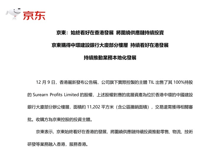 近期,京东集团的一则重磅收购消息引发市场广泛关注——以约35亿港元收购香港中环中国建设银行大厦50%权益,交易底层资产为该大厦部分办公楼层,涵盖公区摊销面积在内的总面积达可观规模。12月9日,香港丽新集团发布相关公告,确认旗下控股主体将标的公司100%股权出售给京东控股的投资主体,目前交易仍待相关审批完成。