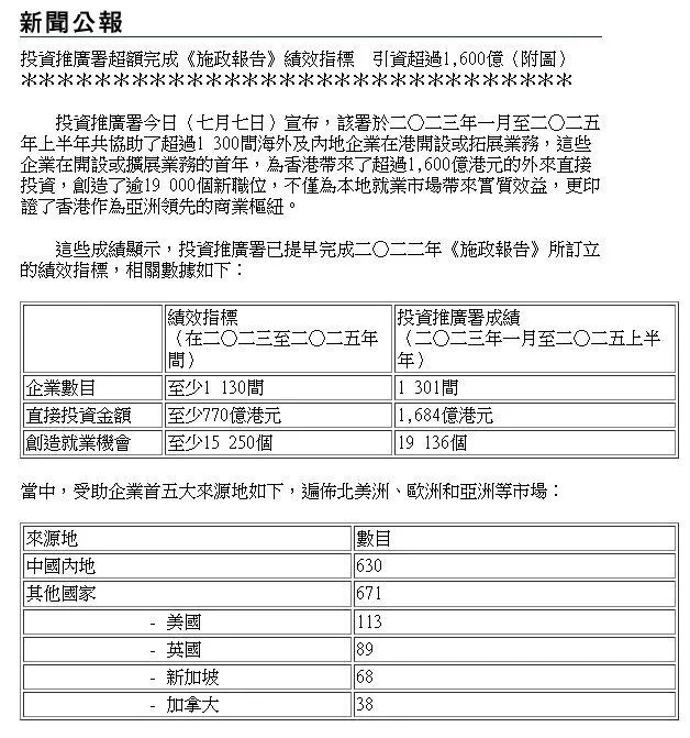 数据显示,期间这些企业为香港带来超过1600亿港元的外来直接投资,创造了逾1.9万个新职位。这一成绩也让香港投资推广署提早完成了2022年《施政报告》中设定的绩效指标——原定2023至2025年间需吸引至少1130家企业、770亿港元直接投资及1.5万个就业岗位,而实际完成量均大幅超额。