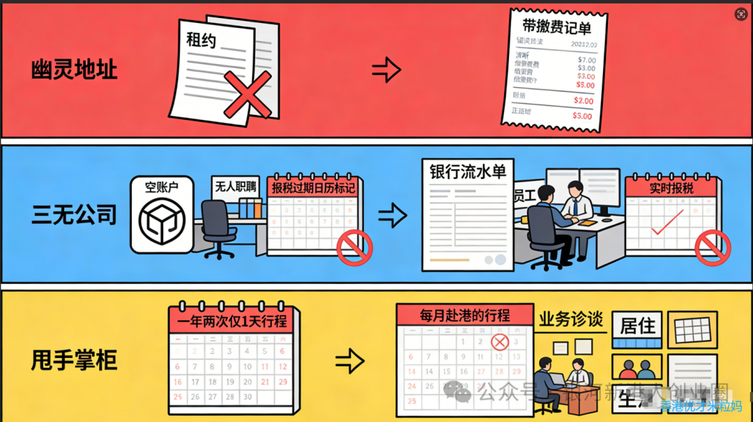 正确做法:规划有说服力的赴港行程。每次赴港,结合业务处理(如见员工、见会计师、考察市场)、居住(在自己租的房子里住几天)、和生活(逛街、消费、朋友聚会)。并保留相关票据、照片、会议记录。