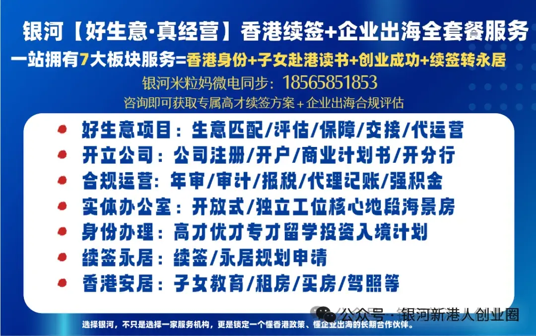 银河集团购买银河【好生意·真经营】服务,你将拥有银河7大板块服务,助您拿到香港身份、子女赴港读书、创业盈利、顺利续签转永居。银河凭借十几年香港服务经验,从高才通申请材料打磨,到香港公司真实运营规划,再到续签转永居关键节点把控,每一步都有专业团队护航,让你既顺利拿身份、子女享优质教育,又能依托香港优势开拓海外市场,实现 “身份 + 事业” 双赢!选择银河,不只是选择一家服务机构,更是锁定一个懂香港政策、懂企业出海的长期合作伙伴。现在咨询,即可获取专属高才续签方案 + 企业出海合规评估!如果你想要了解银河【好生意·真经营】可以加我微信详细了解(18565851853 &17675416895)