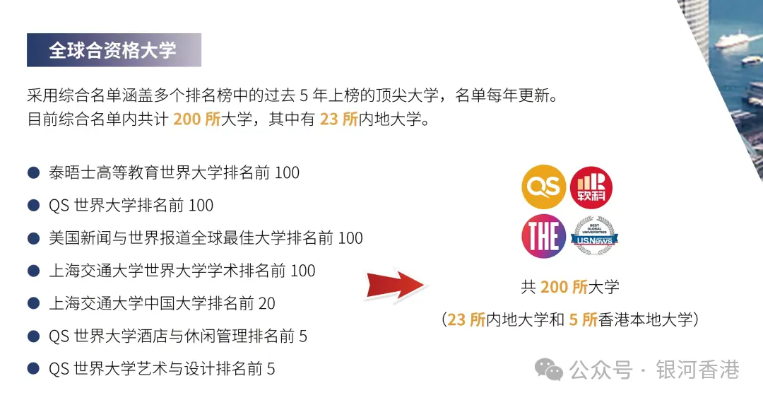 2024年年底,香港高端人才通行证计划(高才通计划)经年度更新的合资格大学综合名单(综合名单)多次更改和调整,合资格名单从176所调整到199所,再到如今的200所,内地院校也增至23所。