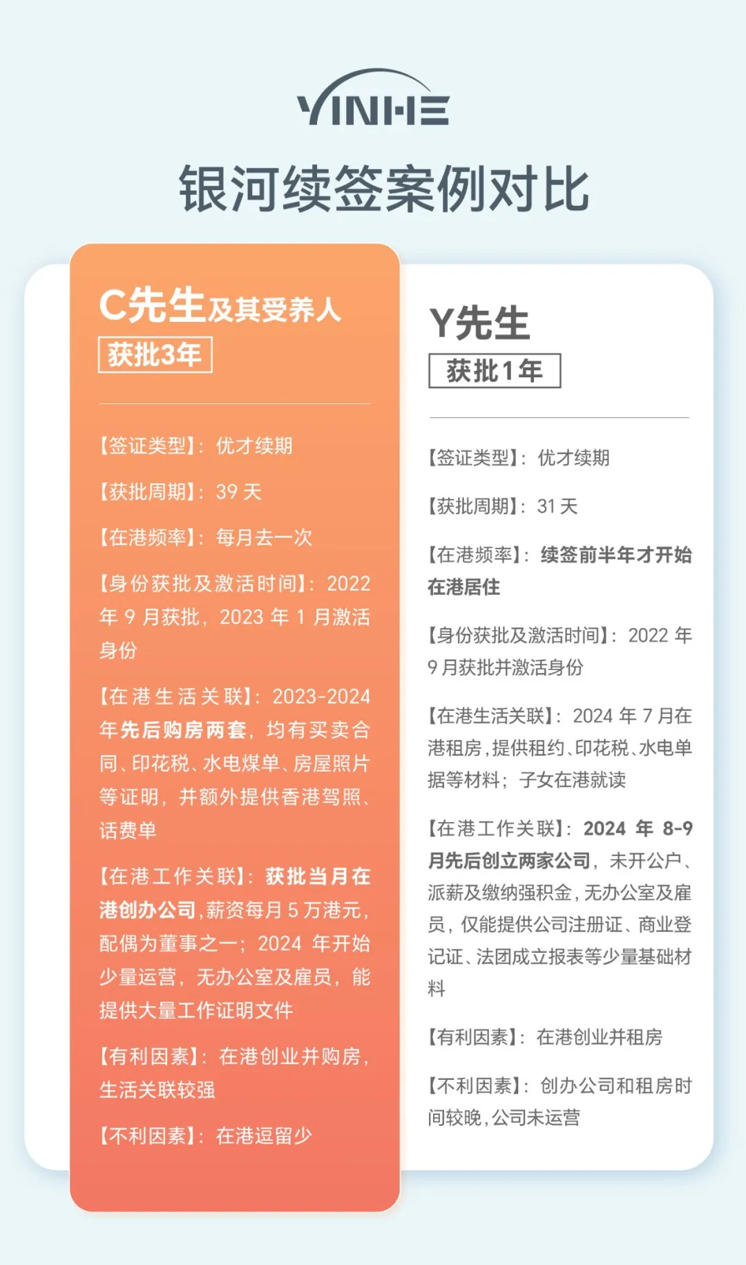 C先生在优才获批后更早就开始规划续签,通过在港创业及购房加强与香港的联系,并能提供相关证明。而Y先生则是在续签前半年才开始考虑续签事项,到港居住和成立香港公司,没有提前规划,所提供的材料无法证明与香港的强联系。