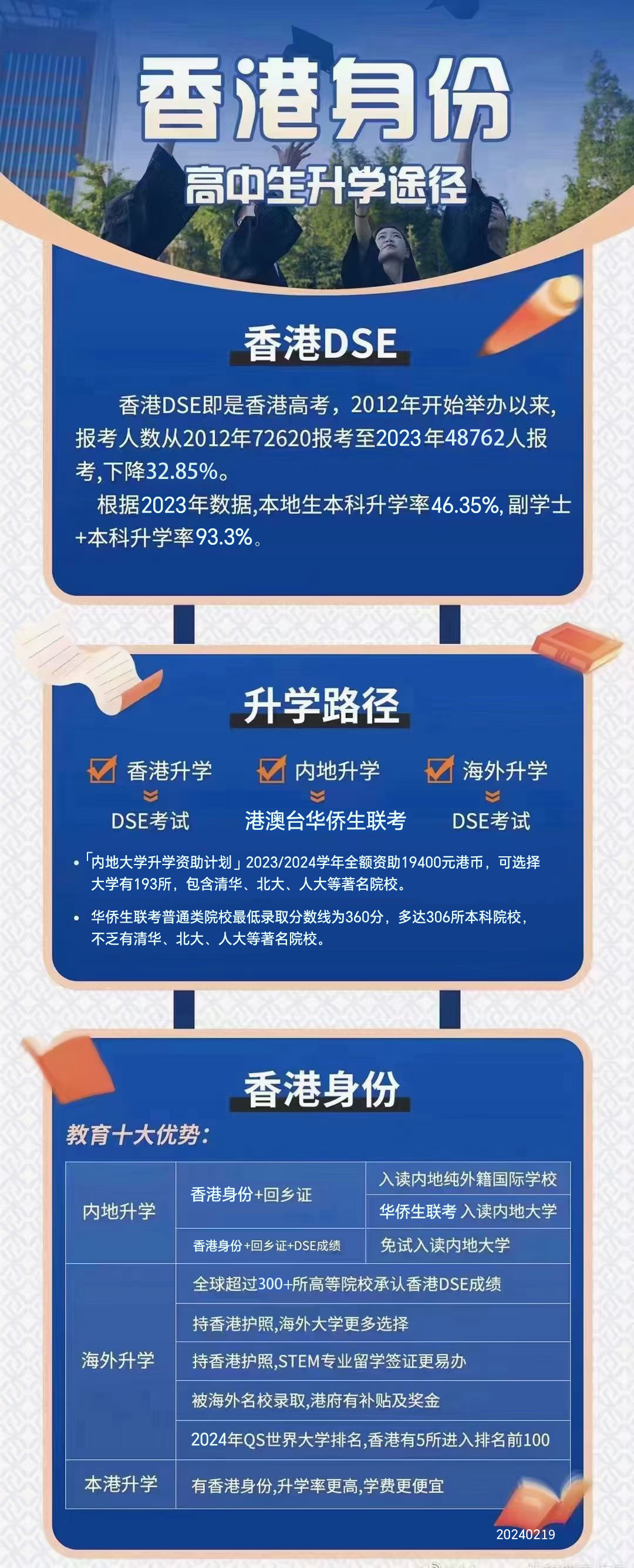 子女升学优势:子女可凭香港身份参加华侨生联考,以较低分数入读内地名校;或通过香港DSE考试,以本地生身份优先入读香港大学。