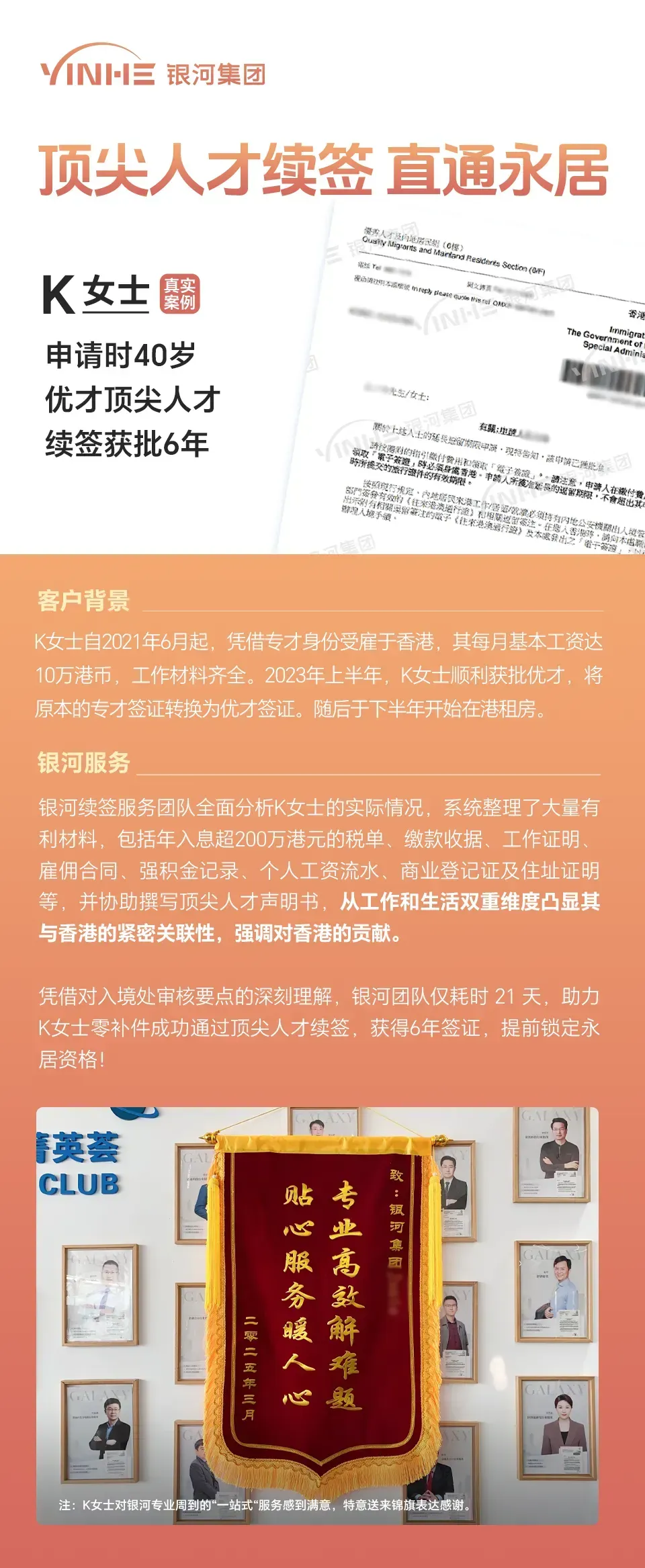 凭借对入境处审核要点的深刻理解,银河团队仅耗时21天,助力K女士零补件成功通过顶尖人才续签,获得6年签证,提前锁定永居资格!