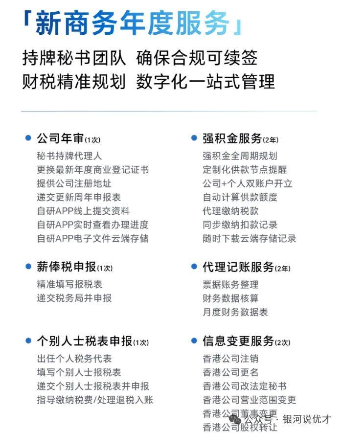 银河集团提供 “一键全包” 的年度经营维护服务,可选2-7年服务,涵盖公司年审、薪俸税申报、个人税表申报、强积金管理、公司信息变更、代理记账及分行年审等全方位保障,免除琐事干扰。